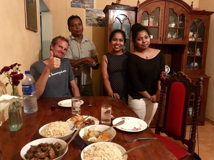Die Übernachtungen buchten wir zu Beginn mit «Air bnb» übers Internet. Wie es so ist, bezahlten wir für unsere erste Übernachtung in Colombo viel zu viel! Wir hatten ja noch keine Ahnung. Sie war in einem grossen, alten Haus einer ehemals berühmten sri lankischen Sängerin. Das Haus hatte Charme, war aber schlecht unterhalten. Es hatte einen schönen Innenhof und lag im alten Viertel von Colombo. Ein guter Ort war unsere zweite Übernachtung in Colombo. Unser Zimmer bot uns den Komfort den wir brauchten: Eine funktionierende Dusche und sogar Air Kondition. Aber das nette war vor allem unser Gastgeber. Wir genossen eine Flasche Wein auf seiner Dachterrasse in Colombo und erfuhren so einiges aus seinem Leben. Er hatte als Funker in der Grossschifffahrt gearbeitet und zog alleine zwei Mädchen gross. Auch über die Zeit im Krieg hat er kurz berichtet, wie es so war während dieser Zeit.