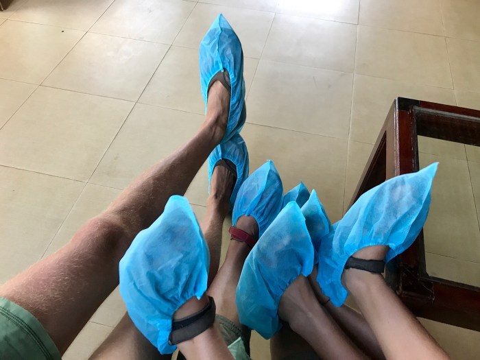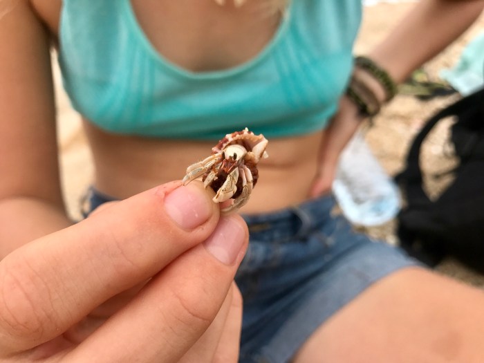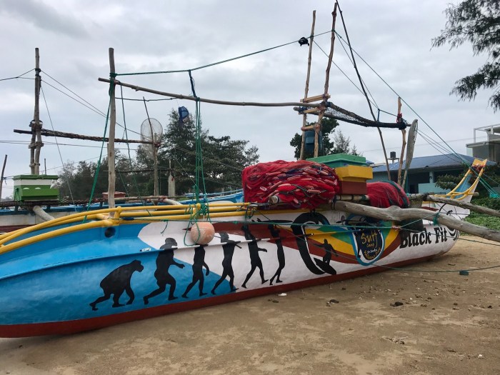 Es gibt einen Surfstrand, nur zehn Minuten vom Hafen entfernt. Einen weiteren grossen Strand gibt es eine zehnminütige Tuck Tuck Fahrt entfernt, dieser jedoch sei viel mehr besucht und jeder wolle da einem etwas verkaufen. So war unsere Wahl klar, die Kinder schulterten ihr lang nicht mehr benutzen Surfbretter und wir liefen die zehn Minuten bis zum Strand. Es war wirklich friedlich – ein paar kleine Bars und Restaurants boten Liegestühle an, wenn man etwas trank und der Strand war übersichtlich. Das hintere Ende des Strandes waren dann nur noch einfache Häuser und Fischerboote.