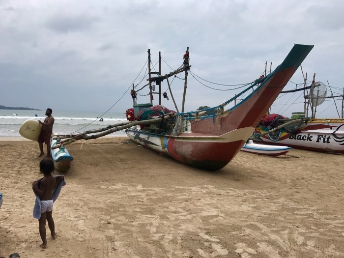 Bald waren wir wieder am Meer. Zogen am langen Sandstrand entlang wo die Wellen laut brachen. Mirissa ist ein bekannter Touristenort. Surfen kann man überall an dem langen Strand. Es erinnerte uns an den Strand von Galle, die Landschaft hatte grosse Ähnlichkeit. Es gab eigenartige Fischerboote am Strand, wo der Fischer nur darin stehen kann. Eine Kuh zog auch den Strand entlang…!