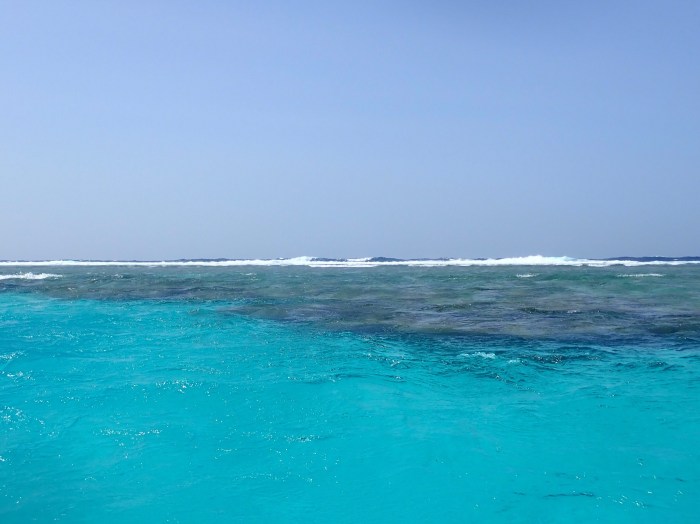 Wir kamen vom tiefblauen Wasser urplötzlich ins helle, türkisblaue Wasser, wo sich die Riffe dunkelblau und gelblichbraun abzeichneten. Über die dunkelblauen kommen wir ohne Probleme hinweg, vor den gelblichbraunen müssen wir uns in Acht nehmen und umfahren. Wir sind überwältigt von der Farbe des Meeres – je weiter wir in die Richtung des Riffes kommen, wo sich die Wellen brechen und es seichter wird, umso leuchtender ist das türkisblau des Meeres. Dieser Anblick ist immer wieder fantastisch und kaum zu fassen. Die Farbe geht direkt ins Herz und ist Seelenbalsam pur!