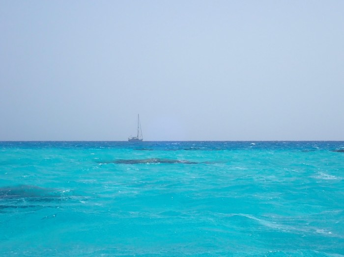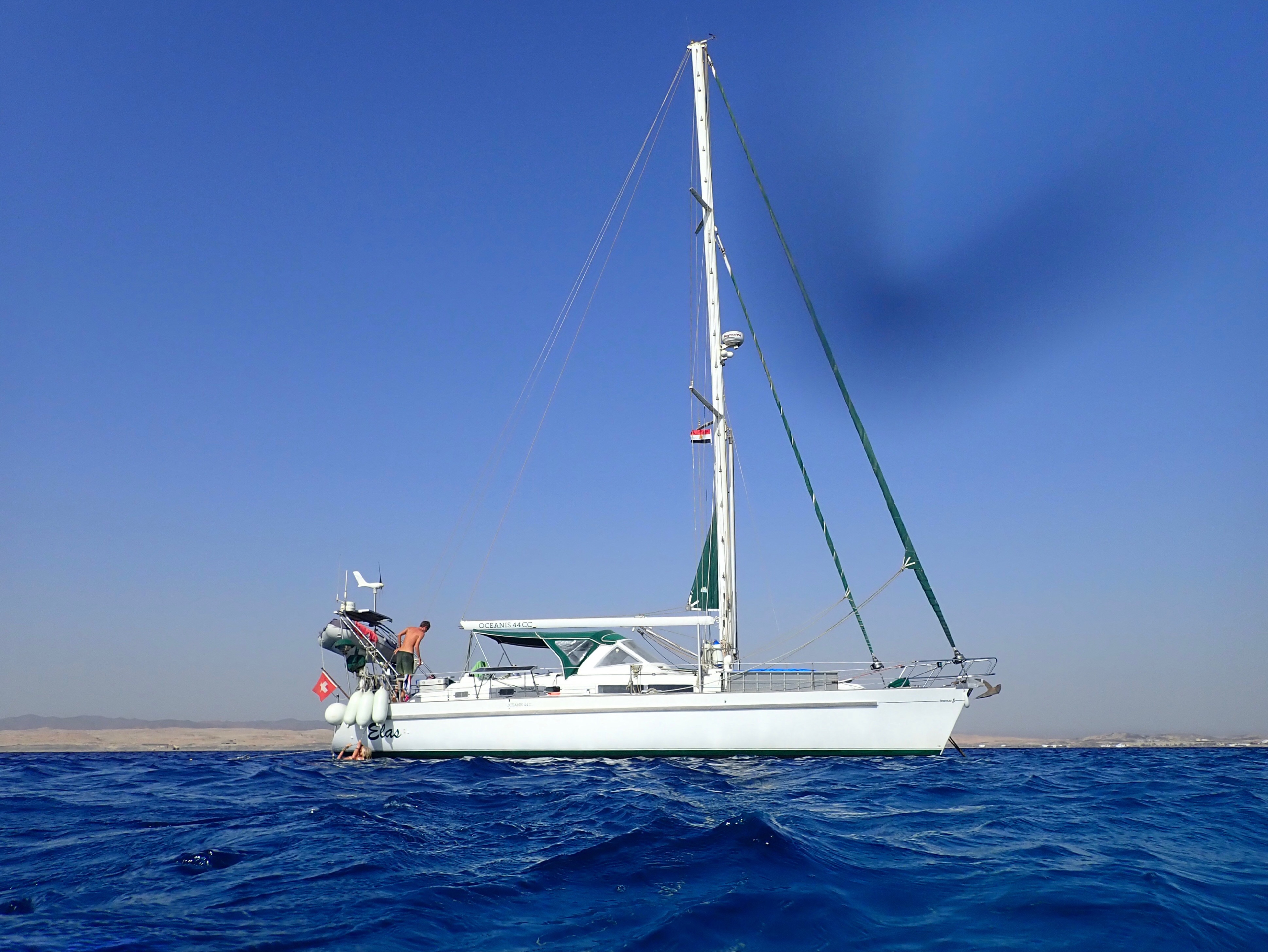 Und es war tatsächlich am Morgen ein wiederum strahlend sonniger Tag! Wir blickten uns ungläubig umher und nur noch die dicken roten Sandspuren zeugten vom vorhergehenden grässlichen Tag. Der Wind blies mit regelmässigen 15 Knoten und trotz den Wellen lag die ELAS ruhig vor Anker. Es war gut.