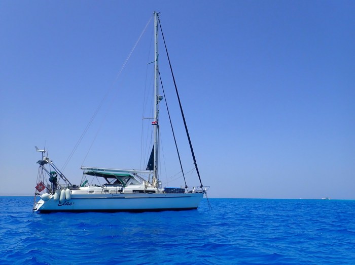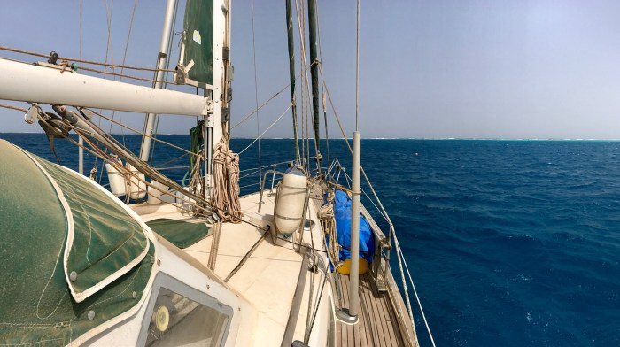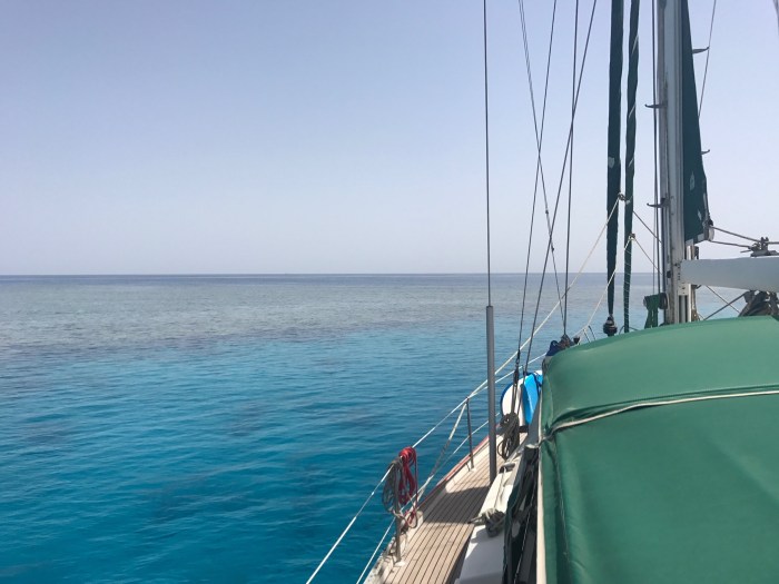 Wir rechneten mit einer kleinen Flaute in der kommenden Nacht. Wir planten diese zu Nutzen und über Nacht in die Nähe von Port Ghalib zu gelangen. Es waren 70sm, die wir hinter uns zu bringen hatten, eigentlich nicht viel, doch mit jedem Kurswechsel drehte auch der Wind wieder, und zwar immer in die Richtung in die wir wollten! Wir brauchten für die ganze Strecke den Motor und kamen am Morgen um zehn bei einem kleinen Riff an, wo wir geplant hatten, über Nacht zu bleiben.