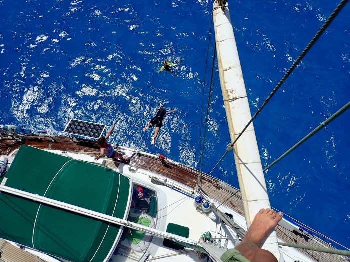 Eine neue Arbeitsaufteilung beim schweisstreibenden Ankermanöver in den Korallen: Kim im Wasser, Lenja an der Ankerwinde und ich am Steuer. Lange Suche bis eine kleine Sandstelle gefunden wurde!