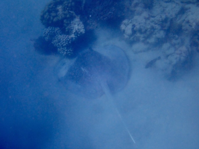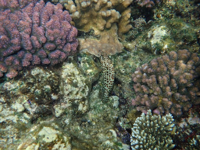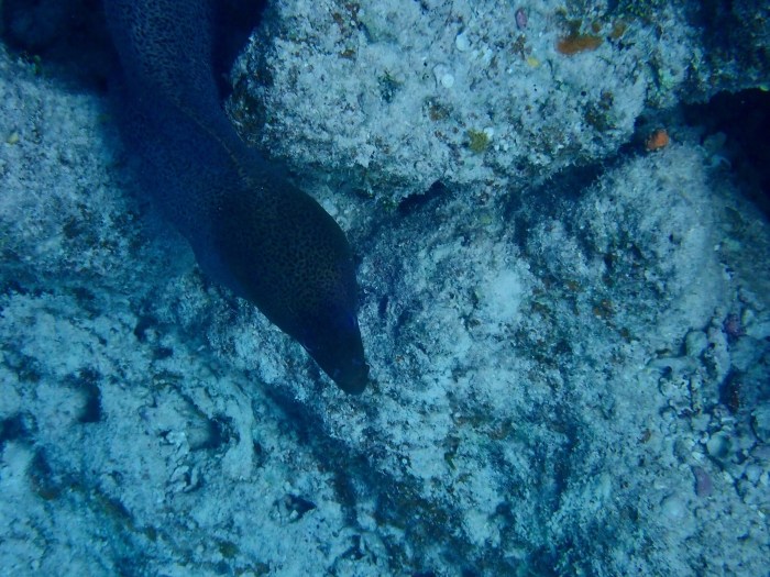 Als wir unseren Adrenalin Pegel wieder gesenkt hatten, hüpften wir alle ins Wasser. Es war unterdessen Mittagszeit und das Licht fabelhaft. Der Vorteil war natürlich, dass wir direkt vom Schiff aus die phänomenale Unterwasserwelt geniessen konnten. Und das war sie – die Riffe fielen tief ab und kamen wieder hoch bis zur Oberfläche, wo die (Feuerkorallen?) im Sonnenlicht glitzerten. Es war ein unbesuchter Ort und wir bekamen grosse Tiere unter Wasser zu sehen: Ein riesiger Rochen buddelte am Grund Sand auf, seine Spannweite war sicher zwei Meter lang. Furchteinflössend war aber die Riesenmoräne, die durch ihr Territorium patrouillierte! Wir begegneten ihr einige Male! Sie war über zwei Meter lang und der Durchmesser ihres Körpers war etwa dreissig Zentimeter. Die Moränen die wir bisher gesehen hatten, waren um einiges kleiner und sassen immer in irgendwelchen Löchern. Dies war ein anderes Kaliber!