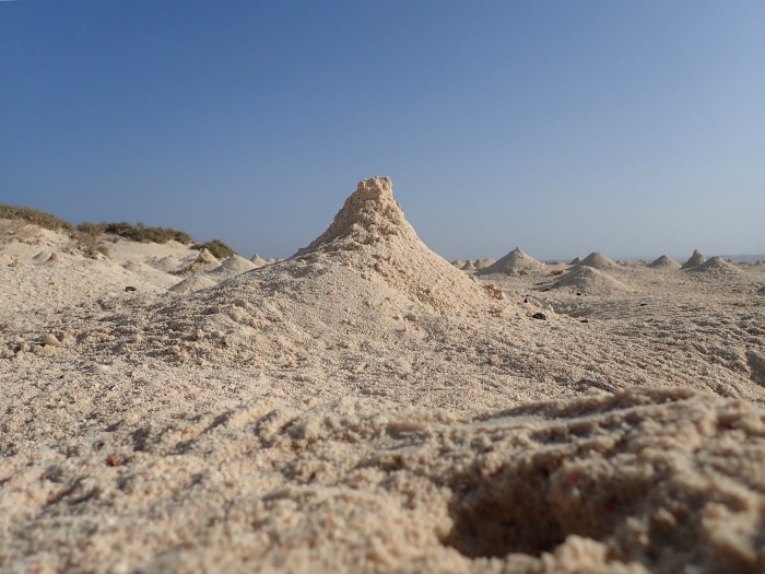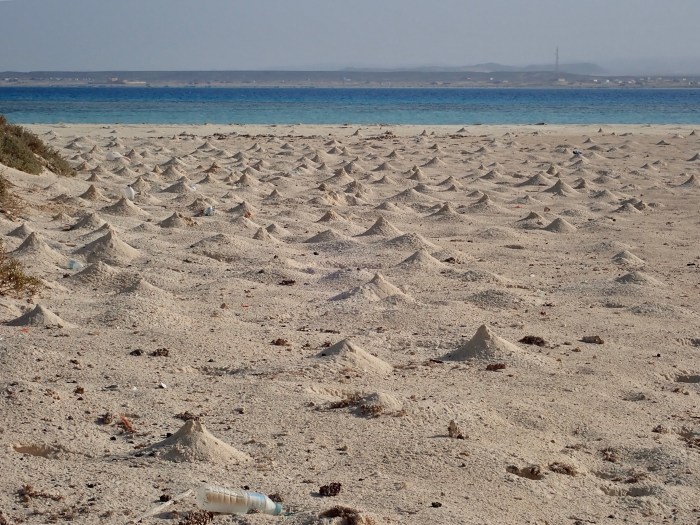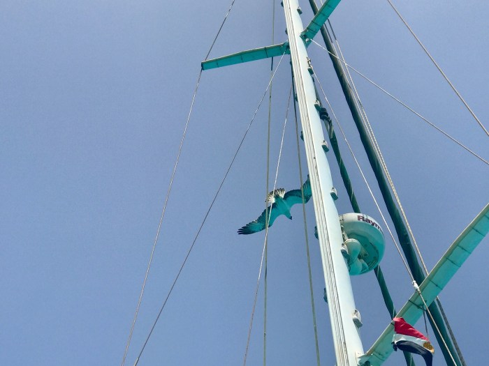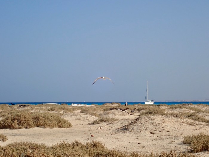 Schon beim Näherkommen konnten wir wieder das leuchtend türkisblaue Wasser sehen – der Ankerplatz sah hinter der flachen Sandinsel sehr vielversprechend aus! Diesmal konnten wir sogar in seichten 5m Wassertiefe ankern, es war fantastisch! Wir schnorchelten vom Boot aus über das grosse flache Riff zur Insel. Überquerten das Inselchen barfuss wo wir von den brütenden Seevögeln angegriffen wurden! Wir sahen auch ein Adlernest mit am Boden, mit Jungen. Lachsfarbige Krebse bauten kleine kegelförmige Hügel und Lenja sagte dazu: «Man merkt dass wir in Ägypten sind – sogar die Krebse bauen Pyramiden!»