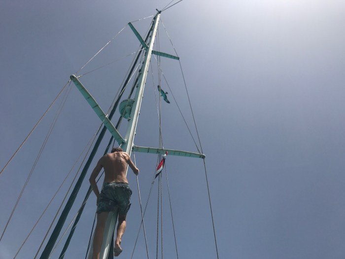 Unter absoluter Konzentration und auf die immer währenden Befehlen von Kim, übermittelt von Lenja die am Bug Ausschau hielt, hörend, drifteten wir langsam über die Korallen, die teilweise erschreckend hoch kamen. Es funktionierte gar nicht übel, das Boot zu steuern, nur als wir den Wind plötzlich von hinten hatten, bekamen wir zu viel Fahrt… Es kam mir ewig vor, wie wir da hin und her, im Zick Zack durchs Wasser fuhren. Irgendeinmal befanden wir uns wieder an dem Fleck, wo wir schon zu Beginn waren. Es war wohl der einzige, ein paar Meter lange Sandfleck der gesamten Bucht, und dort liessen wir dann gezielt den Anker hinunter. Es war ein Paradebeispiel für ein gelungenes Teamwork. Kim im Wasser, Lenja am Bug, ich am Steuer und Neele mit beiden Daumen gedrückt….! Meine Erleichterung und auch die Freude, dass es mit dem Manövrieren so gut geklappt hatte, war gross – aber ich brauchte noch einen kurzen Moment, bis das Leben wieder weitergehen konnte!