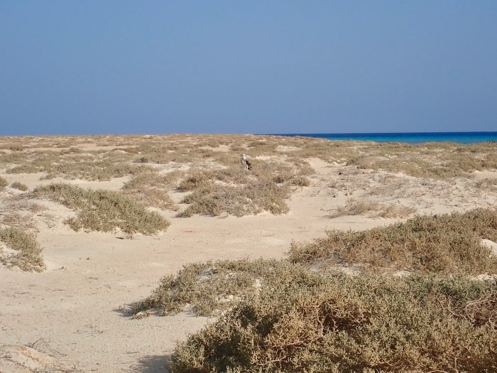 Tatsächlich war die ganze Bucht beim Kap, wo wir in der Ferne in der Wüstenlandschaft ein Paar Bretterhütten, ein paar Menschen und ein Dromedar in der Sonne liegen sahen, voller Korallen.