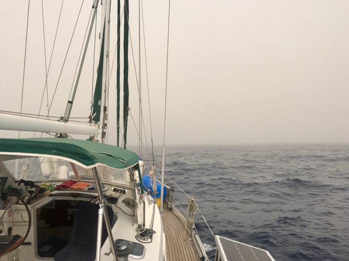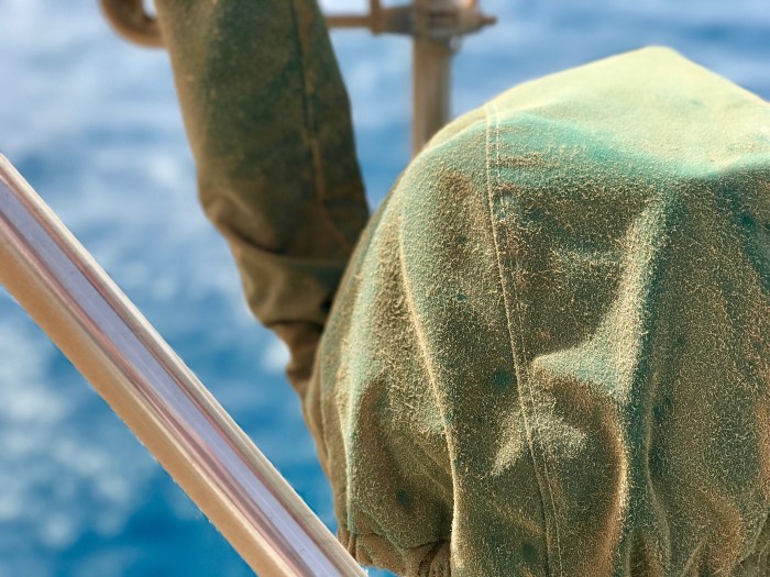 Am nächsten Morgen ist die Luft wieder klar doch das Boot mit einer Dicken Staubschicht bedeckt! im Hintergrund ist die Boje wo sich unser Anker befindet