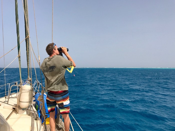 In der Morgendämmerung sahen wir dann noch etwas anderes, das uns Sorgen bereitete: Es war ein Dunst in der Luft, der die Sonne kaum mehr durchliess. Und dieser wurde immer dichter, das Wasser spiegelte sich bläulich im grauen Umfeld. Zuerst dachten wir es sei Regen, doch dann bemerkten wir den roten Staub, der sich überall auf dem Boot absetzte. Bald war unser grünes Sonnenverdeck rot und unser weisses Deck auch. Es war krass. Die Sicht setzte sich auf Null herab und so wollen wir in ein Riff hineinfahren, mit vielen gefährlichen einzelnen Korallenstöcken, die man nur mit «Eyeball Navigation» sicher passieren kann?! Das ist nicht die Entscheidung, die wir treffen würden! Wir zogen es in Erwägung, umzudrehen und zurück zu fahren aber es war zu weit. Es gab nur noch VORWÄRTS, ob wir wollten oder nicht. Unter grossem innerlichen Druck kämpften wir uns vorwärts in Richtung des Riffs. Die Wellen liessen langsam nach und wir bekamen die ersten einzelnen Riffe zu sehen, die von den Wellen wild umschäumt waren, ein wichtiges Indiz um die Riffe zu erkennen wenn kein Sonnenlicht da ist. Mit angespannter Mine und höchster Konzentration hielten wir vorne am Bug, voll dem Wind ausgesetzt, Ausschau nach Riffen und dirigierten den Kapitän darum herum. Schliesslich fanden wir einen Sandflecken in 15m Tiefe, wo wir den Anker herunter liessen. Trotz meinem innigen Wunsch, dass das Ankern ohne Zwischenfälle gut verlaufen wird, hatten wir dann trotzdem noch ein Problem. Zur Sicherheit wollten wir ein Seil mit einer Boje am Anker anbringen, damit wir den Anker allenfalls mit Hilfe des Seils wieder heben könnten, falls wir an einer Koralle hängen blieben… Wir waren nicht zufrieden mit dem Platz, wir schwojten zu nahe ans Riff heran, also hoben wir den Anker wieder. Dabei verschwand plötzlich unsere Ankerboje im Wasser und wir hingen mit dem Boot nur noch am Seil, das sich unter einer Koralle verklemmt hatte. Wie gesagt, es war grau in grau, windig und wellig…. Kim verschwand kurz im Wasser um die Situation zu betrachten. Ich wünschte mir sehnlichst, dass bald alles in Ordnung kommt – der Anker sicher und gut unten. Nach ein paar Manövern mit dem Motor kam dann das Seil los und wir legten noch ein paar Meter hinter uns zu einem besseren Platz. Da war endlich gut.