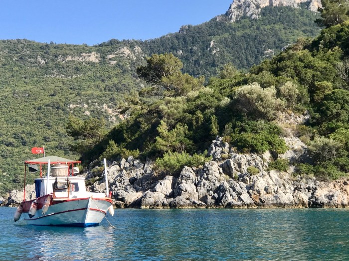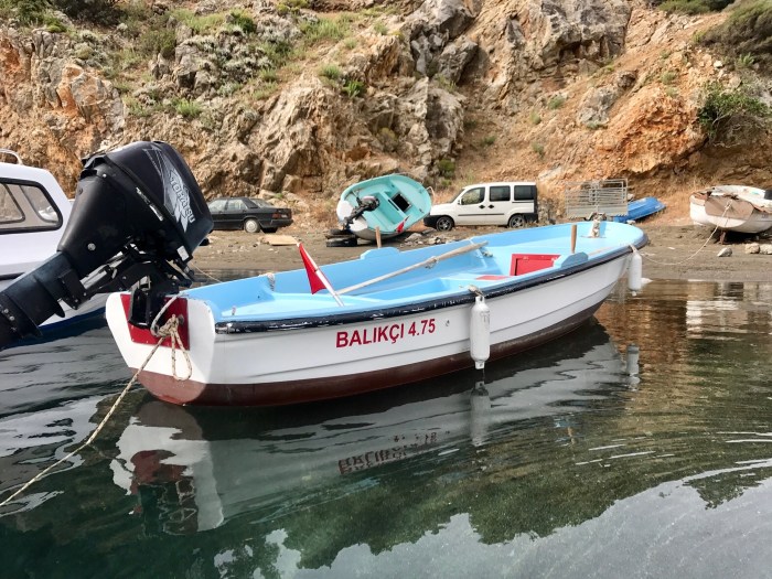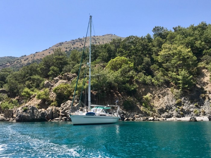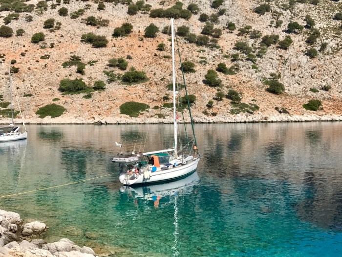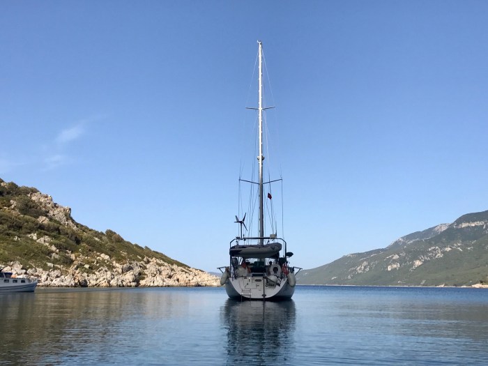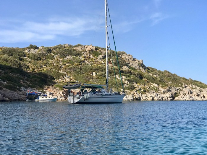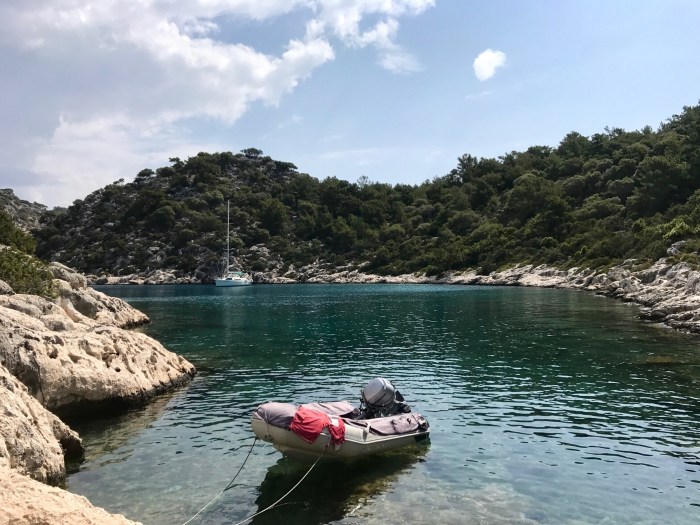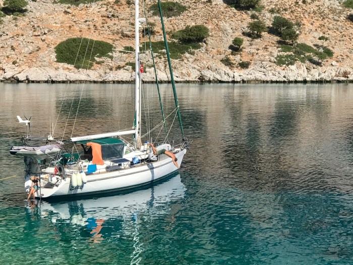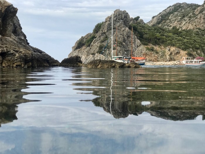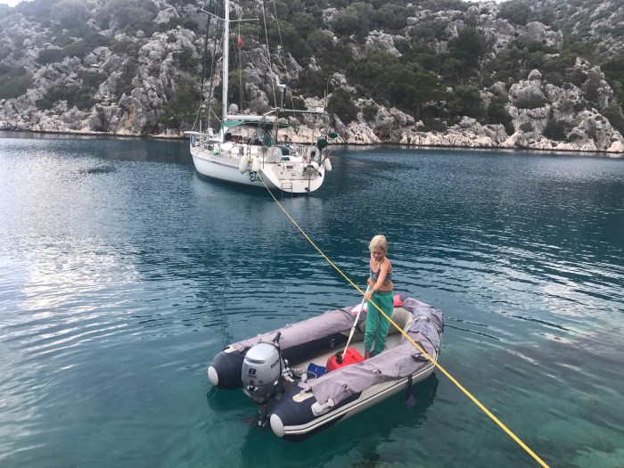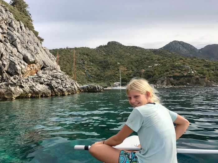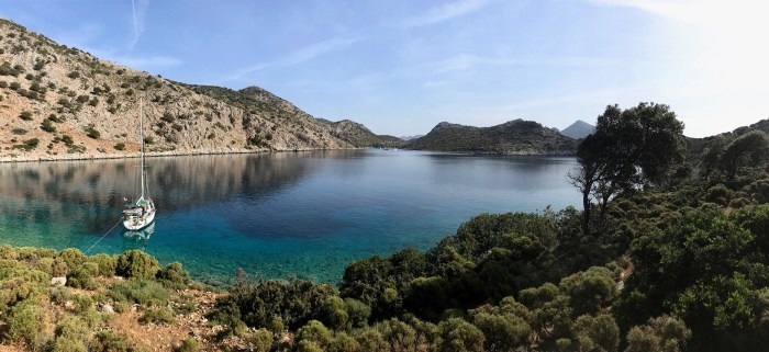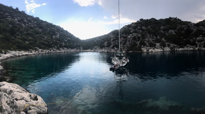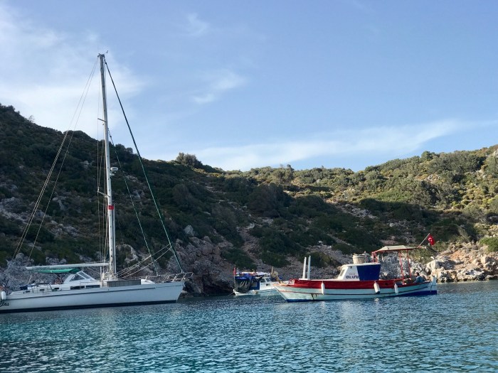 Wir waren nun direkt südlich von Bodrum, auf der Nordseite der langen schmalen Halbinsel von Datca. Es gibt in der Gegend in der Türkei, wo wir uns seit Tagen befinden, einfach so viele tolle kleine Buchten wo man ankern kann. Jede ist wunderschön! Wir kommen in die kleine Bucht mit einem kleinen Kieselstrand, wo schon zwei kleine Fischerboote liegen. Es war Wochenende und wir vermuteten, dass es vielleicht Hobbyfischer waren. Lenja übernahm wieder die Leine und schwamm hinüber zum Ufer, um einen passenden Stein zum festmachen zu finden.