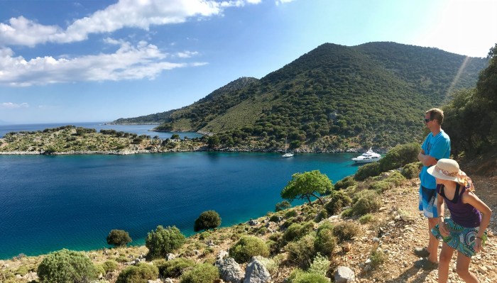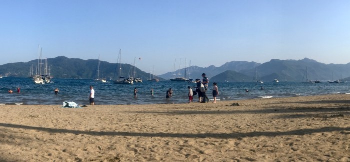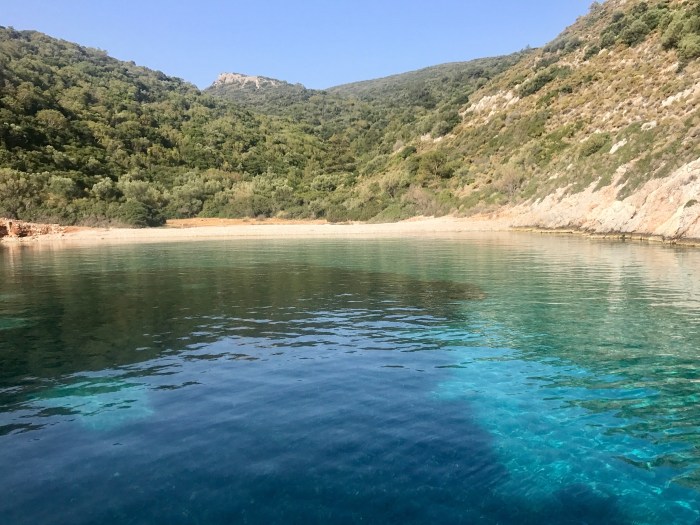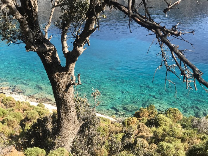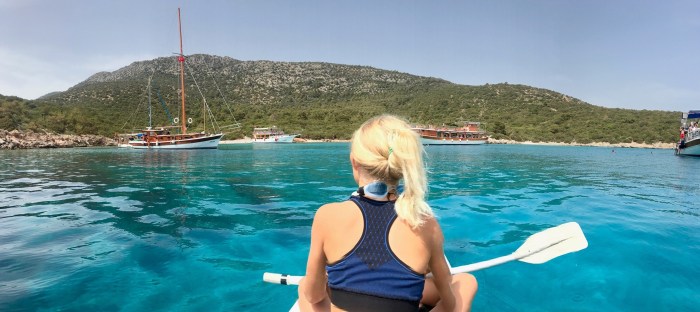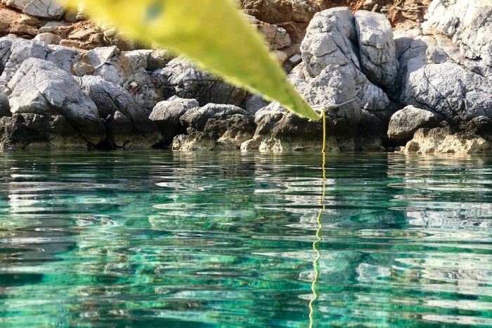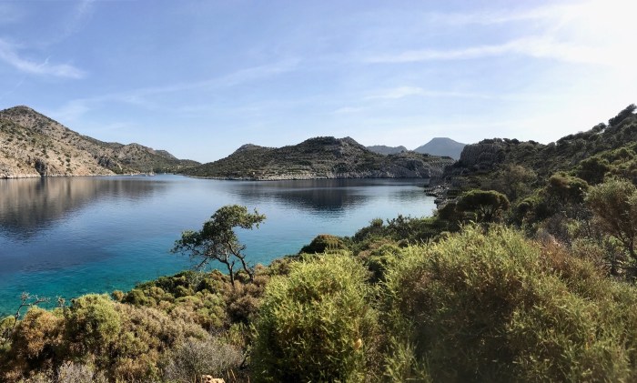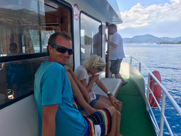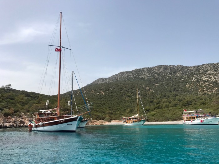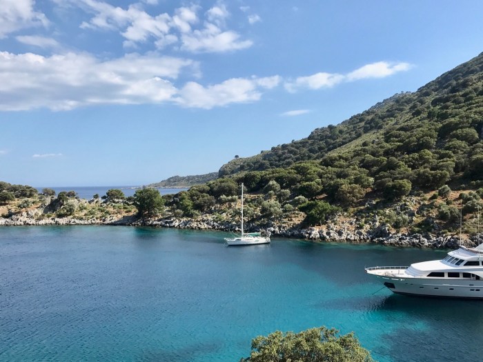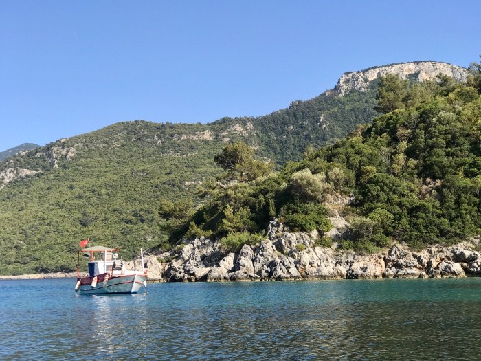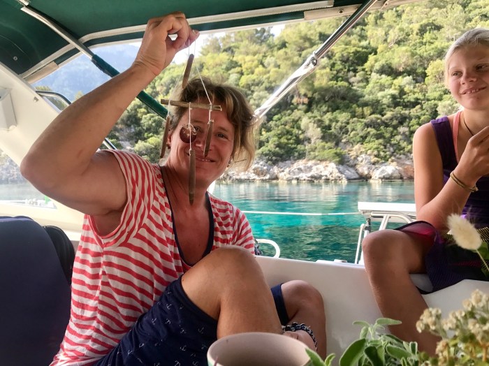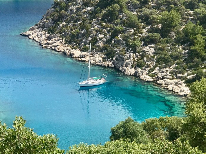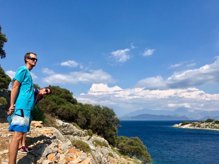Wir waren nun direkt südlich von Bodrum, auf der Nordseite der langen schmalen Halbinsel von Datca. Es gibt in der Gegend in der Türkei, wo wir uns seit Tagen befinden, einfach so viele tolle kleine Buchten wo man ankern kann. Jede ist wunderschön! Wir kommen in die kleine Bucht mit einem kleinen Kieselstrand, wo schon zwei kleine Fischerboote liegen. Es war Wochenende und wir vermuteten, dass es vielleicht Hobbyfischer waren. Lenja übernahm wieder die Leine und schwamm hinüber zum Ufer, um einen passenden Stein zum festmachen zu finden.