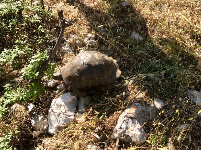 Anderntags wollten wir, nach so langer Zeit an Bord, uns wieder mal so richtig die Beine vertreten. Die Berge von Finike sahen zu diesem Zweck sehr verlockend und steil aus! Wir durchquerten das moderne Dorf das an den Hang gebaut war und kamen an immer kleiner und älter werdenden Häusern vorbei, je höher wir stiegen. Bis wir schlussendlich die Häuser hinter uns gelassen hatten und wir nur noch wildlebenden Schildkröten begegneten! Das war eine Überraschung, diese Tiere so zahlreich in der wilden Natur zu finden. Auf unserer Wanderung begegneten wir sicher 5 Tieren, die langsam über die Steine und durch die Büsche krochen.