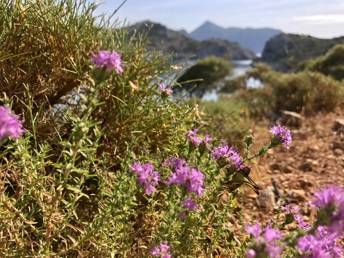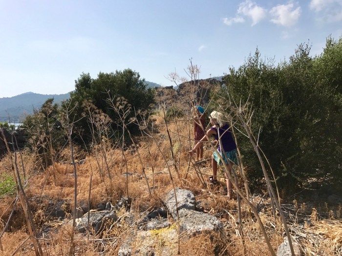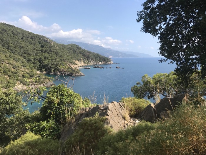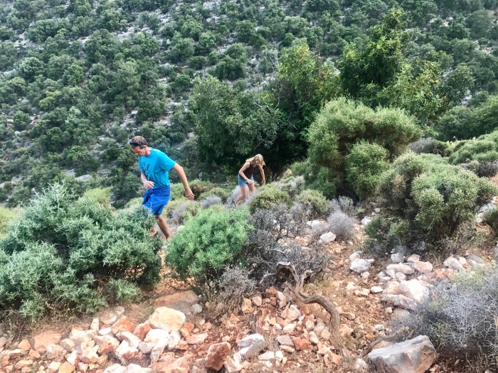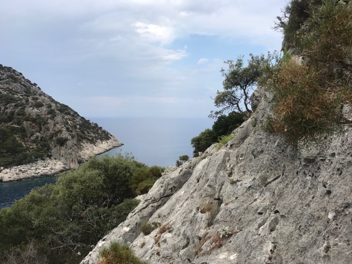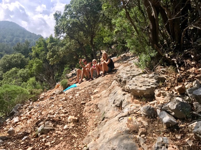 Es kam aber ein bisschen anders. Der verlockend schöne Wanderweg hörte nämlich plötzlich auf und wir bemerkten, dass wir in einer Sackgasse gelandet waren. Der Wanderweg war gemäss Karte 200m Luftlinie entfernt – kein Problem! Nur, wir waren auf einer Krete… Wir stiegen mal aufs Geratewohl über grosse Steine gegen das Tal bis es nicht mehr weiter ging, weil wir an eine steil abfallende Wand kamen! Also gings wieder über Stock und Stein hinauf! Wir drei fandens lustig und abenteuerlich – aber die Kleinste überhaupt nicht! Sie konnte es kaum fassen, was wir da taten! Und es war ja auch nicht «Ohne», das musste man schon ihr lassen.. Irgendwann fanden wir dann nach viel Kletterei glücklicherweise den rot/weiss markierten Wanderpfad! Hatten von da an noch einen langen aber wunderschönen Weg zurück nach Finike! Mit vom Klettern Muskelkater in den Oberschenkeln und ziemlich zerkratzten Beine trafen wir dann froh wieder in Finike ein!
