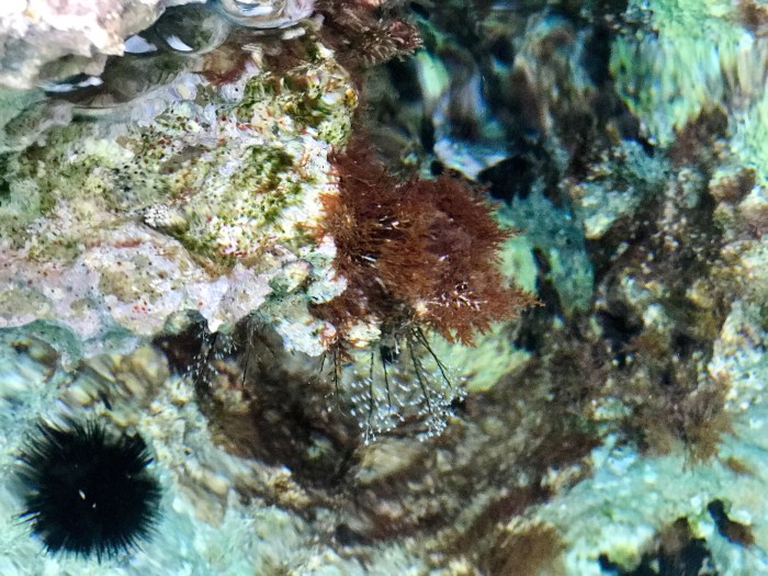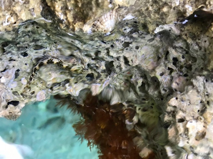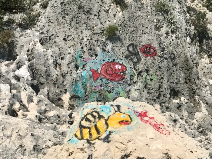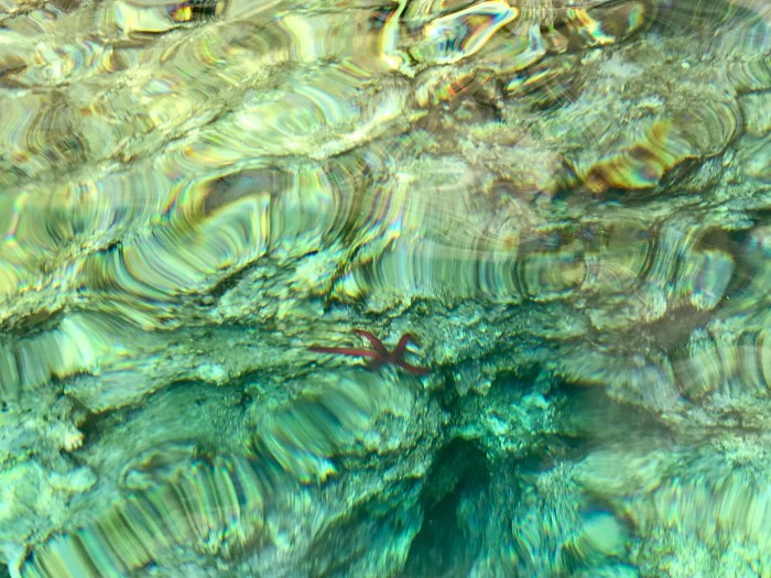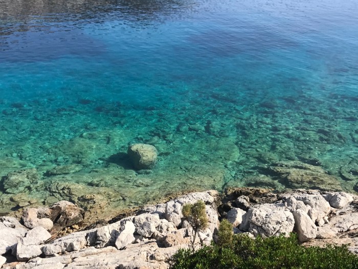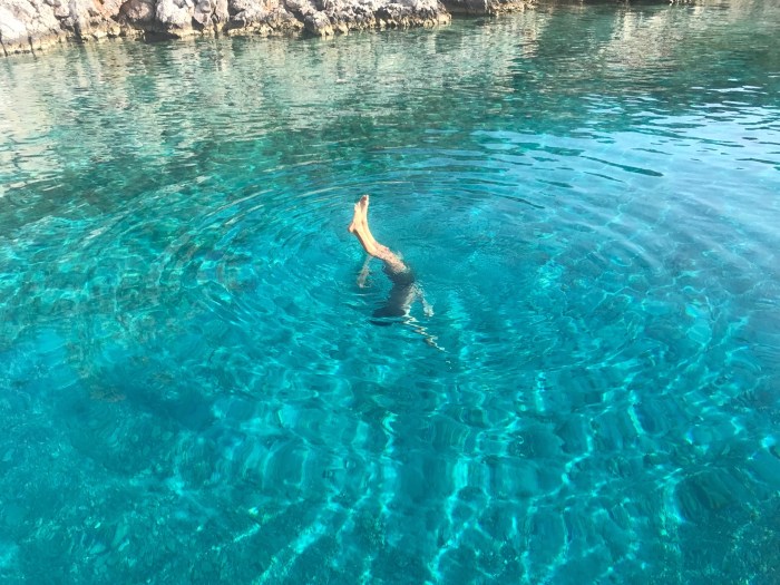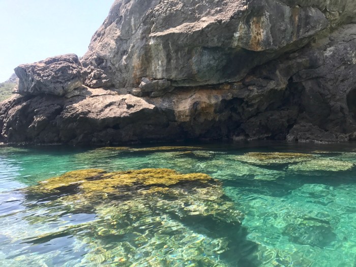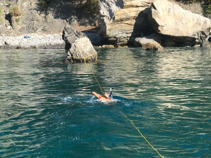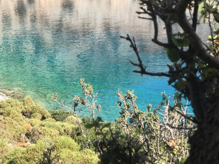 Wiederum ist das Wasser ein Traum! Das Licht reflektiert beim den Felsen entlang Schnorcheln an den weissen Felsen, es kommt mir vor wie schwimmen im Aquarium! Die Kinder suchten den karg bewachsenen Hang nach Blumen und Pflanzen ab…