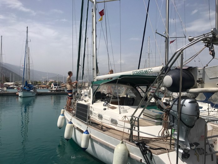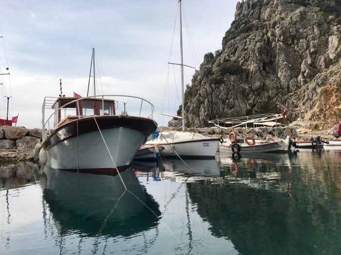 Der nächste Plan war, im Hafen der Ferienstadt «Kalkan» festzumachen. Wieder eine Abwechslung zu der einsamen Bucht. Es hatte noch viel Platz in dem kleinen Hafen, es ist ja auch noch früh in der Saison. Wir legen «römisch katholisch», das heisst mit dem Anker vorne und zwei Leinen hinten an der Mauer an.