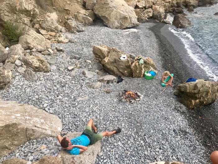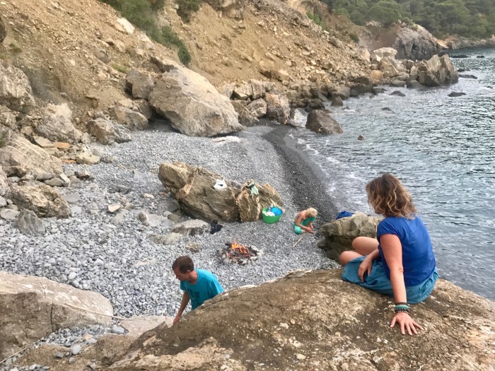 Es war einfach fantastisch, wo wir waren! Wir konnten es selber kaum glauben. Wieder im Mittelmeer und an so wundervollen Orten geankert zu sein wie diesem war einfach genial. Wir taten was man an so Plätzen tut, wir erkundeten die Umgebung indem wir querfeldein über Stock und Stein auf die Hügel kletterten und die Aussicht genossen. Mit dem Dinghy eine Tour einmal rundherum machten und uns ins noch sehr kalte Wasser stürzten. Die Kinder machten ein kleines Feuer direkt hinter unserem Boot auf den Steinen, um Marshmallows zu braten. Es war ein fantastischer Platz und wir waren froh, wieder in dem tollen Heim-Segelgebiet angekommen zu sein!