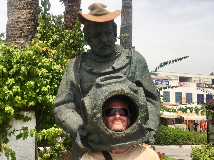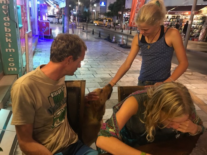 Gümbet ist die Schwesterbucht von Bodrum und ist über den Hügel mit Bodrum zusammengewachsen. In unserem Reiseführer hiess es, es sei besser in Gümbet zu ankern. Es war eine grosse Bucht und es gab viel Platz, das Schiff lag gut vor Anker. Es war am späteren Nachmittag als wir uns an Land begaben, um einen Augenschein zu nehmen. Es war enttäuschend und gefiel uns nicht. Alles machte ein wenig einen heruntergekommenen Eindruck, der Strand, die Häuser… Wir stiegen weiter hoch in das Zentrum und da fanden wir einige riesige Partytempel! Also war Gümbet das Zentrum für Junge und Partyleute! Es war wohl auch günstiger als das, wie sich herausstellte, das noble Bodrum. Wir schlenderten noch gemütlich durch die Strassen, vorbei an vielen Touristenshops und Restaurants, die viele davon leer waren. Es fehlte noch an Touristen, war noch früh in der Saison doch man konnte erahnen, wie viele Leute im Sommer sich tummeln würden. In einem der vielen Restaurants assen wir dann zu Feier meines Geburtstages noch zu Abend, die Kellner gaben alles, um ihre Gäste zu unterhalten und zufrieden zu stellen!