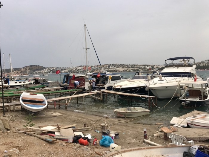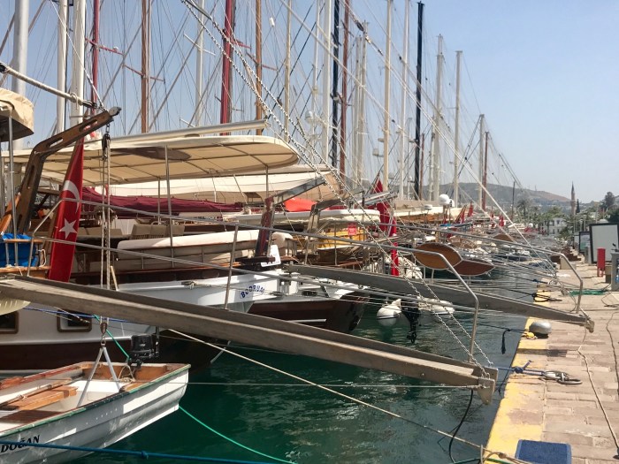 Später folgten die vielen Yachten und Ausflugsboote die sich in passender Ordnung an der langen Hafenmauer reihten. Wir sahen in Bodrum die grossen, edlen und auf Hochglanz polierten typischen Holzyachten der Türkei. Es war sehr interessant.