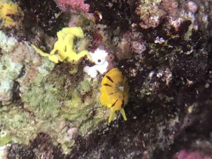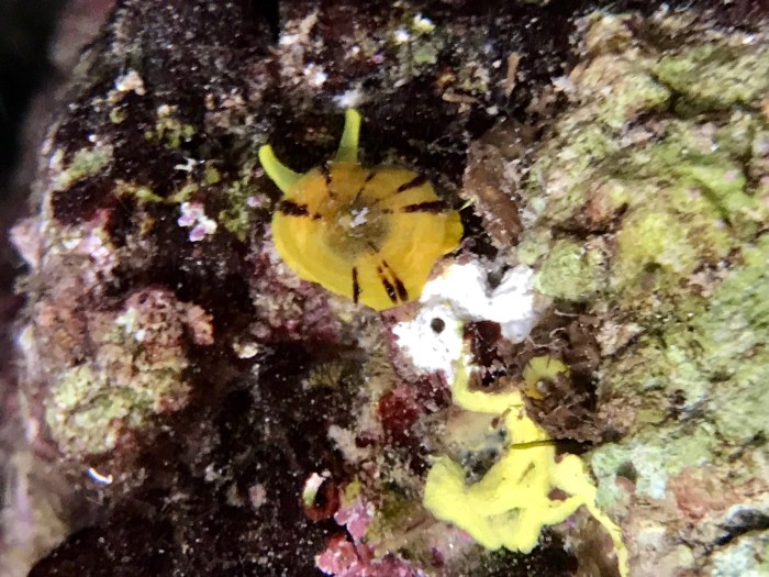 Wir entdecken viele der winzig kleinen Goldschwamm Schnecken, kein typischer «Nudibranch» weil diese Nackt sind und die hier ein Häuschen haben