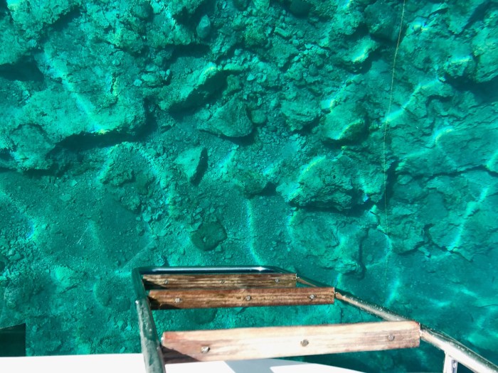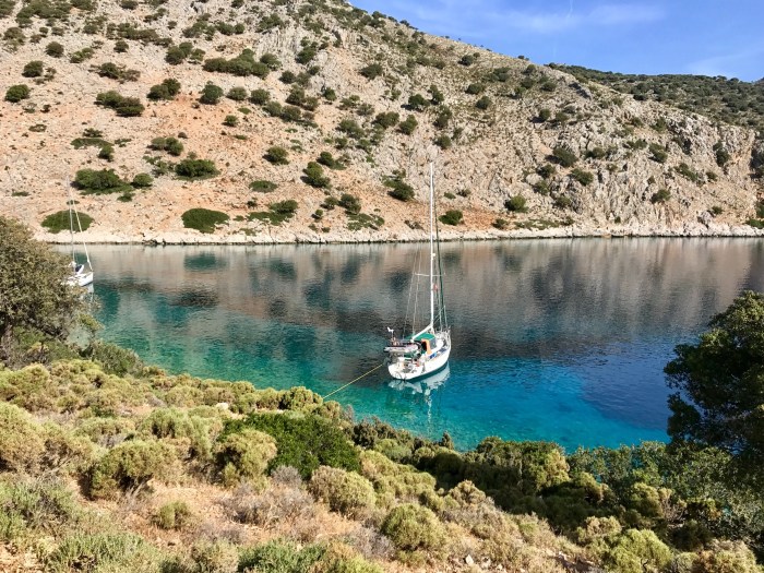 Je weiter wir in den Einschnitt hinein kamen, umso schmaler wurde er doch immer noch genug tief. Das Wasser war türkisblau und man konnte den Grund sehen. Wir fuhren bis fast zum Ende des Einschnittes und legten dann den Anker quer auf der andern Seite nahe dem Ufer auf den Grund. Wir zogen das Boot rückwärts bis nur ein paar Meter an das andere Ufer zurück, wo dann einer von uns mit einer Schwimmleine ans Land schwimmt und die Leine um einen Stein festmacht! Wir lieben diese Art Ankern! Es ist so toll, so nahe am Ufer zu sein. Als wir mit dem Manöver fertig waren, war es schon am späten Nachmittag. Es war gut, wir lagen geschützt und gut vertäut zwischen den Felsen.